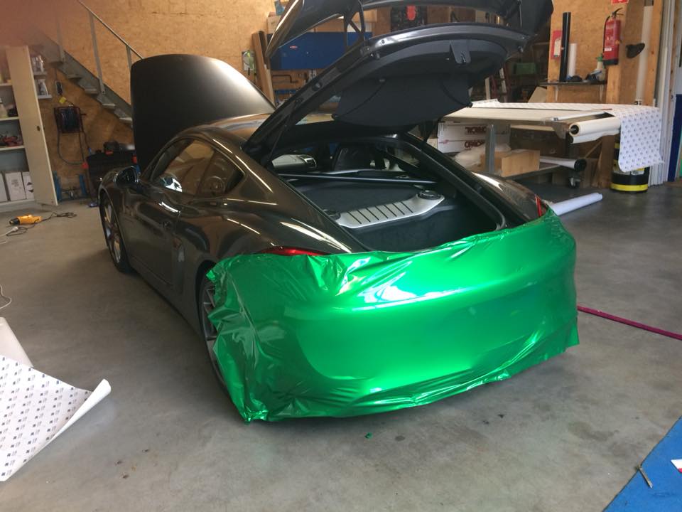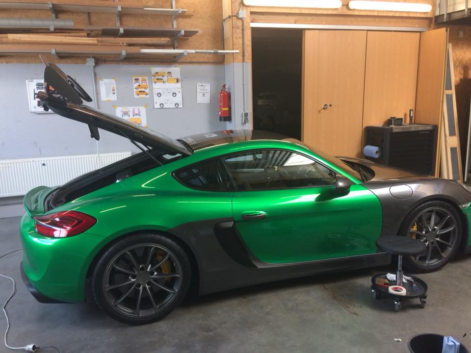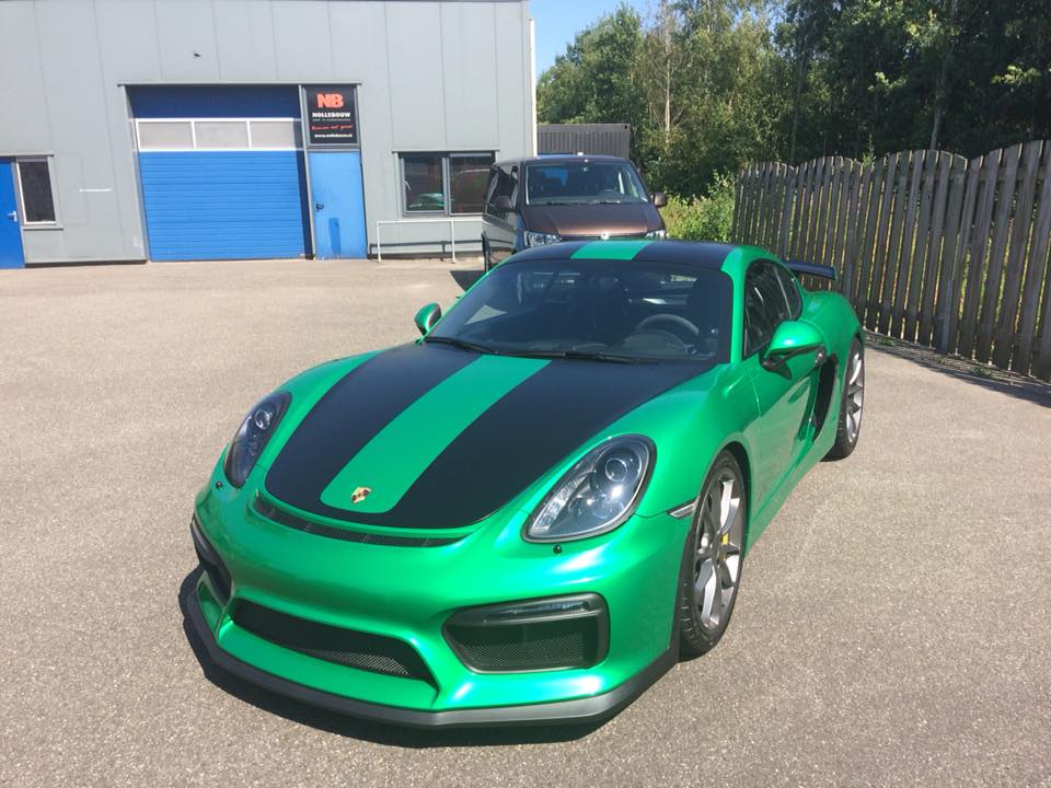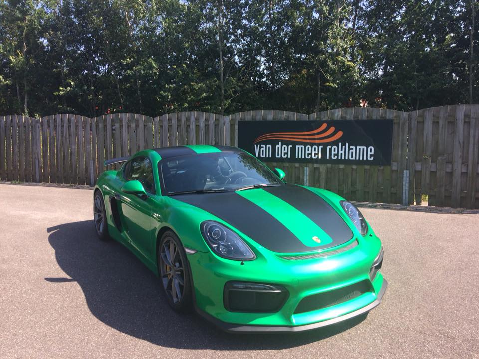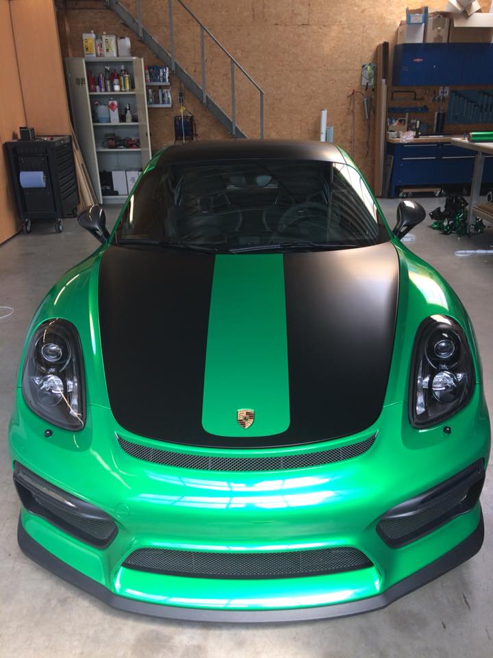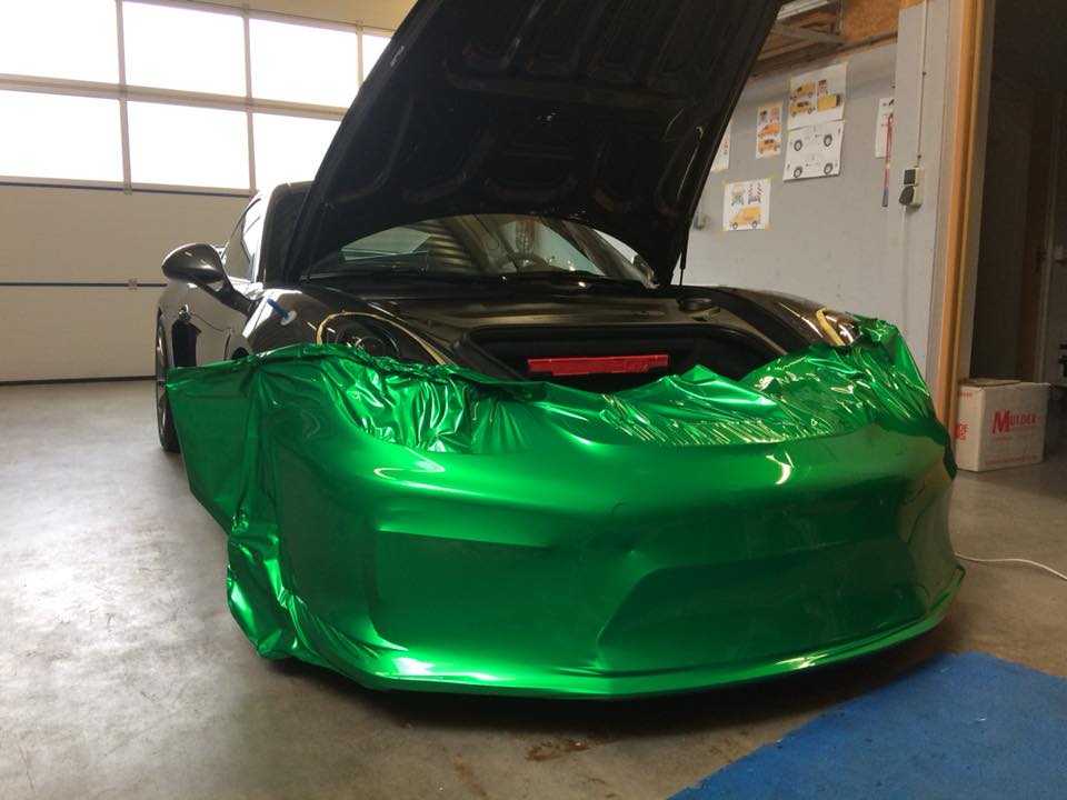 Carwrap Porsche GT4 in metallic groen en zwarte folie.