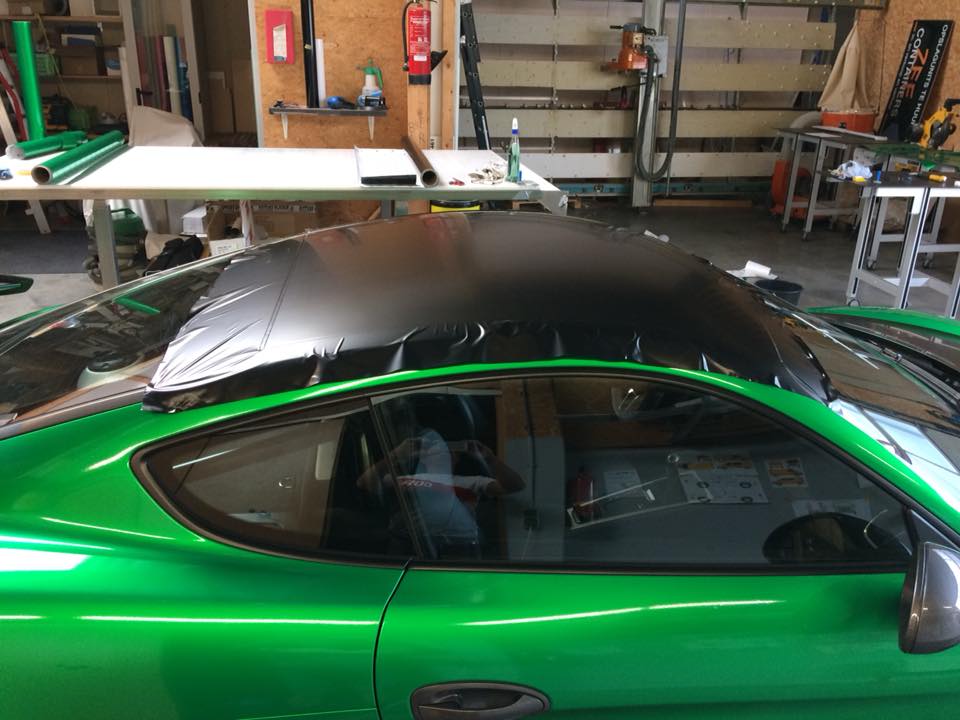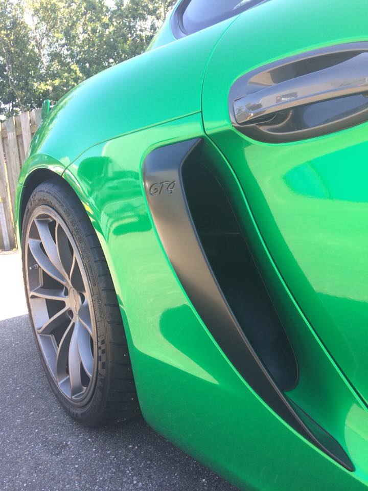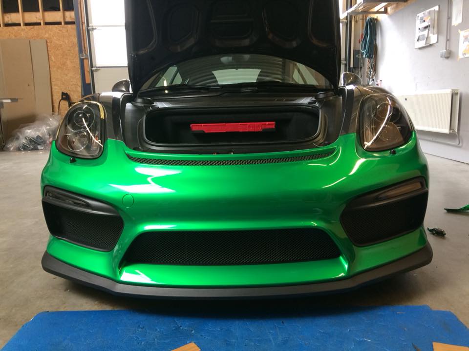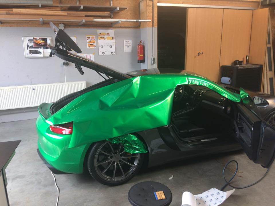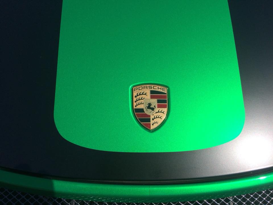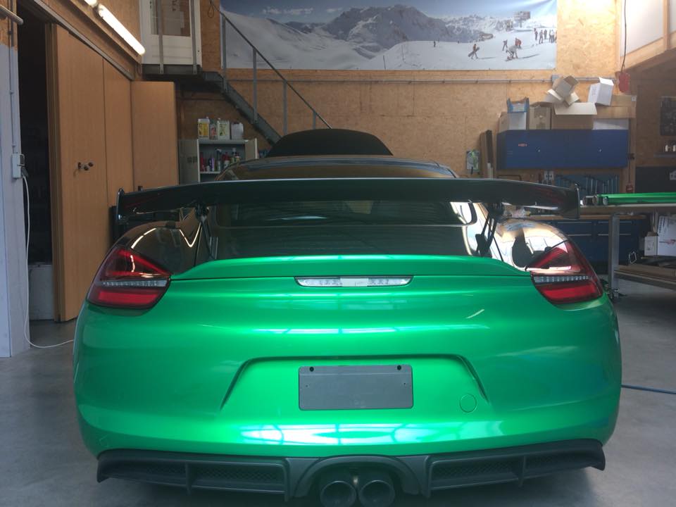 Carwrap Porsche GT4 in metallic groen en zwarte folie.